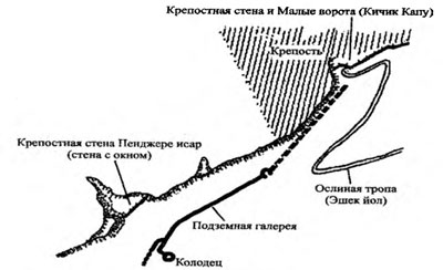 В литературе было несколько указаний на существование в Старом городе Чуфут-Кале колодца, ведущего за пределы крепости к источнику, находившемуся на склоне горы, недалеко от подножия обрыва. О таком колодце упоминал в 1895 г. С.Шапшал. М.Я. Фиркович в 1907 г. писал о колодце Сукур-Кую (слепой колодец), или Тик-Кую (прямой колодец): «Это грандиозный сход, косо вырубленный тоннелем к воде. Отверстие этого тоннеля на Бурунчаке ныне скрыто под кучей камней». Пользуясь этими немногочисленными и неоднозначными данными, симферопольские исследователи А.Ф.Козлов, Ю.А. Полканов и Ю.И.Шутов начали поиски колодца, которые довольно быстро увенчались успехом. В августе 1998 г они заложили поисковый раскоп на склоне Чуфут-Кале к югу от крепостной стены Пенджере-Исар (рис. 1), и уже на второй день было вскрыто устье колодца. На расчистку всего сооружения, которое оказалось сложнейшей гидротехнической системой, ушло более трех лет! Вначале разборка осуществлялась вручную, потом на смену ручному труду пришла механизация - расчистку стали вести с помощью электрической лебедки. Колодец был заполнен глыбами известняка и суглинистым материалом, в котором были обнаружены обломки керамики и кости животных. Диаметр колодца у устья - 1,8 м. Когда колодец был расчищен до глубины 25 м, сбоку открылся широкий ход-галерея, также заваленный камнями. К ноябрю 2001 года удалось расчистить всю систему; масштабы которой поражают! Ведь вырублена она была вручную в плотной породе - мергеле. Глубина колодца составляет 45 м, причем его нижняя часть представляет собой винтовой ход (рис. 2, фото 1). У внутреннего края винтового хода сохранились следы предохранительного бордюра.